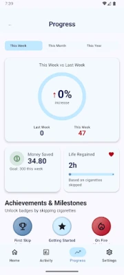 A Quit Smoke alapfilozófiája merőben eltér a piacon lévő más megoldásoktól: nem kényszerít azonnali leszokásra, hanem a tartós, fenntartható változást ösztönzi. Kezdje egyszerűen a nyomon követéssel, hogy megértse jelenlegi mintáit, majd állítson be reális, fokozatosan csökkenő célokat. Intuitív funkcióinkkal, mint például az egyérintéses cigaretta naplózás és a kiváltó okok elemzése, pontos képet kaphat arról, miért és mikor gyújt rá. Ráadásul vizuális trendek, csúcsidő-azonosítás és az alapvonalhoz viszonyított összehasonlítás révén értékes betekintést nyerhet, melyek segítenek azonosítani és kezelni a nehézségeket. Adatai 100%-ban privátak és biztonságosak maradnak.