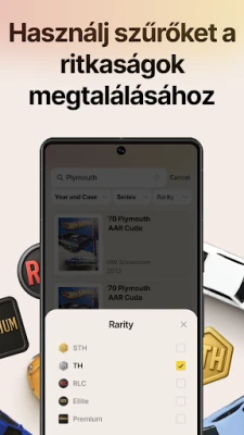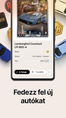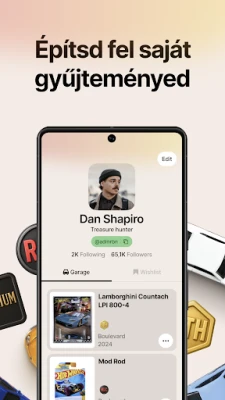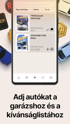 A DieCarz egy rendkívül gazdag adatbázissal büszkélkedhet, mely az 1968-as kezdetektől napjainkig számtalan Hot Wheels modellt felölel, beleértve a prémium, RLC, Elites és ikonikus Treasure Hunt sorozatokat is. Soha többé nem kell a régóta keresett darabok után kutatnia; könnyedén azonosíthat és hozzáadhat bármilyen járművet a Garázsához vagy Kívánságlistájához, akár évjárat, széria vagy ritkaság alapján szűrve. Felejtse el a duplikátumokat és a kihagyott lehetőségeket! Sőt, a közösség erejével az adatbázis folyamatosan bővül, így sosem marad le egyetlen kuriózumról sem. Gyűjteményének rendezését is a DieCarz okos funkciói segítik, akár vásárlási dátum, év vagy név szerint rendezve.