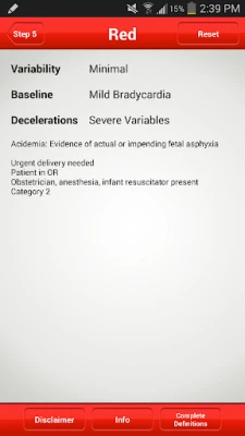 A **FHR 5-tier** alkalmazással a bonyolult értékelési folyamat egyszerűvé válik. Felejtse el a 134 lehetséges kombinációt tartalmazó táblázatok tanulmányozását, vagy a decelerációk összetett definícióinak memorizálását, amelyek gyakran zavaróak lehetnek. Az alkalmazás intuitív felületén, egymást követő képernyőkön, gombok segítségével adhatja meg a variabilitást, az alapvonalat, valamint a decelerációk alakját, nadírját és időtartamát. A **FHR 5-tier** automatikusan kiszámítja a deceleráció súlyosságát és az adott nyomvonalhoz tartozó színkategóriát, azonnali, egyértelmű eredményeket szolgáltatva. Az eredmények egy színes összefoglaló képernyőn jelennek meg, ami megkönnyíti a gyors és hatékony kommunikációt a kollégákkal.