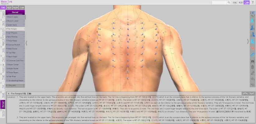 A széleskörű hozzáférés érdekében az alkalmazás három nyelven – koreai, angol és kínai – érhető el, így a világ számos pontjáról származó szakemberek és tanulók számára is használható. Egyedülálló módon a Master Tung Acupoint alkalmazás egyszerre teszi lehetővé a Tung-féle akupunktúrás pontok (Dongssihyeol) és a hagyományos fő akupunktúrás pontok együttes megtekintését. Ezt egy speciálisan kifejlesztett „Alapvonal" (Baseline) funkció egészíti ki, amely jelentősen megkönnyíti a Tung-pontok pontos azonosítását és megtalálását. A tartalom felügyeletét koreai orvosi egyetemek professzorai és orvosai végezték, garantálva a pontosságot és a megbízhatóságot. Fontos megjegyezni, hogy bár ez az alkalmazás kiemelkedő részletességgel foglalkozik a Dongssihyeol rendszerrel, a fő akupunktúrás pontok vagy a meridiánok teljes szöveges leírását nem tartalmazza. Ezekért a mélyreható ismeretekért, valamint az extra akupunktúrás pontok és más rendszerek feltárásáért érdemes megismerkedni a verderoot, acumonster és medimonster által kínált további speciális alkalmazásokkal.