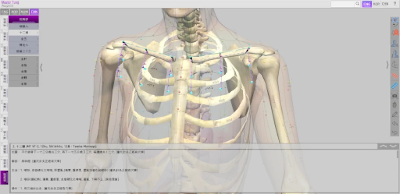 Lépjen be az emberi anatómia mélységeibe forradalmi 3D modellezésünkkel, amely izmokat, csontokat, szerveket és az agyat is részletesen bemutatja. A Master Tung Acupoint alkalmazás interaktív funkcióival – mint például az átlátszóság szabályozása, a nagyítás, kicsinyítés, jegyzetek készítése, rajzolás, elrejtés vagy szövegírás – személyre szabott tanulási élményben lehet része. A kijelzési lehetőségekkel választhat, hogy csak a bőr, csak az izmok, vagy csupán a meridiánok és akupunktúrás pontok jelenjenek meg, így pontosan arra fókuszálhat, ami a tanulásához vagy gyakorlásához éppen szükséges. Ez a vizuális megközelítés mélyebb betekintést nyújt a Tung-pontok precíz elhelyezkedésébe és a környező anatómiai struktúrákba.