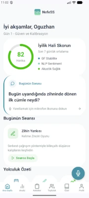 A NefeSS „Aynalama Teknolojia" a hangelemzést és a természetes nyelvi feldolgozó (NLP) motort alkalmazza, hogy pontos, személyre szabott wellness (jóllét) pontszámot készítsen az Ön számára. Ez a pontszám egy tiszta tükröt tart elénk, segítve megérteni jelenlegi lelkiállapotát. Az elemzési eredmények alapján a „Şifa és Kürasyon" funkció azonnal reagál: személyre szabott meditációs gyakorlatokat, inspiráló könyveket és filmeket javasol, amelyek célzottan támogatják a belső gyógyulást és a szellemi fejlődést. A NefeSS minden egyes javaslata gondosan kiválasztott, hogy rezonáljon az Ön egyedi igényeivel.